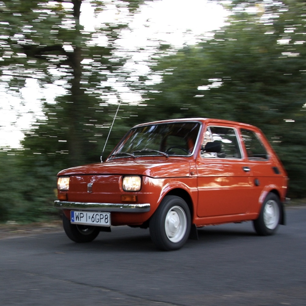 zabytkowym, 50-letnim Fiatem 126p, odtworzonym do oryginału z dbałością o